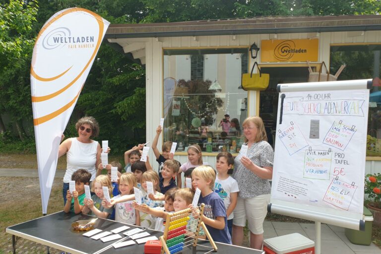 Die Kinder des Evangelischen Kindergarten Starnberg haben am letzten Mittwoch vor dem Weltladen Starnberg ihre selbstgemachten Schokoladen-Tafeln verkauft. Alle Zutaten stammen vom biologischen Anbau und wurden über den Weltladen Starnberg beschafft, um menschenwürdige Arbeitsbedingungen und faire Löhne zu unterstützen.