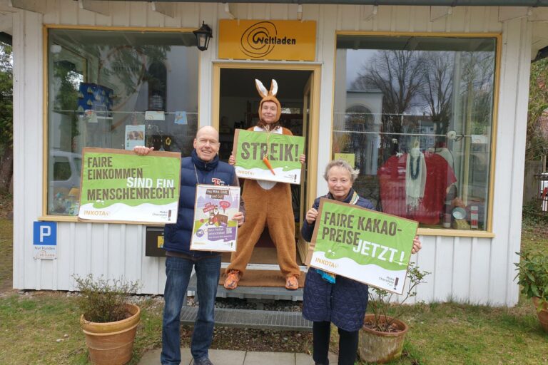 Am Samstag, 16.03.2024 ab 10 Uhr protestierte der Osterhase auf dem Starnberger Kirchplatz. Jedes Jahr machen Schokoladenunternehmen zu Ostern den größten Umsatz, gleichzeitig erhalten Kakaobäuerinnen und -bauern in Westafrika noch immer einen viel zu niedrigen Kakaopreis. Weiterlesen |