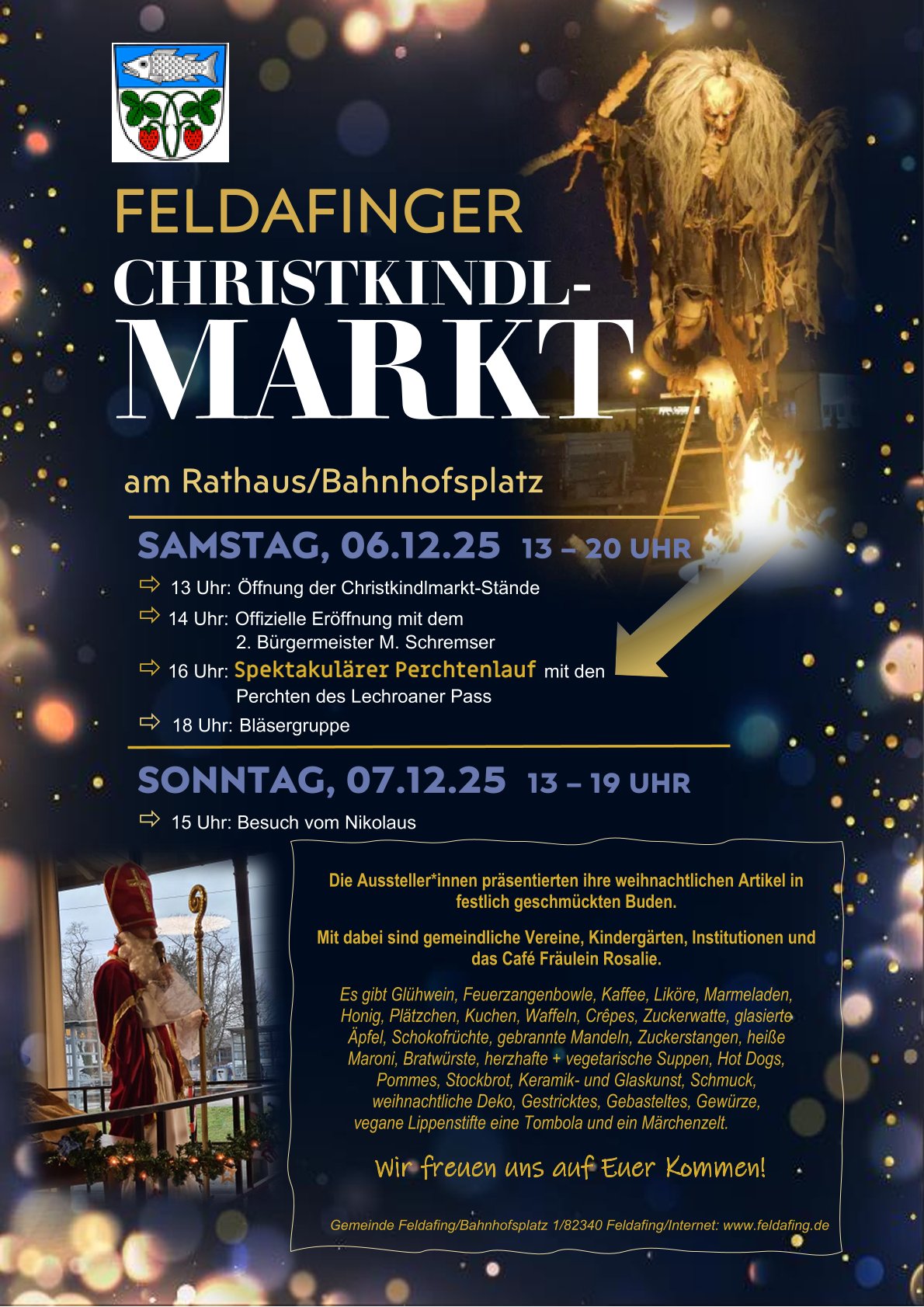 Dieses Jahr können Sie uns am 2. Advent (6./7.12.25) wieder zweimal treffen: Wir sind auch auf dem Feldafinger Christkindlmarkt. Genießen Sie ein eindrucksvolles Rahmenprogramm in familiärer Atmosphäre vor dem Feldafinger Bahnhof.